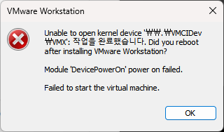 Unable to open kernel device '\\.\VMCIDev\VMX':작업을 완료했습니다. Did you reboot after installing VMware Workstation?